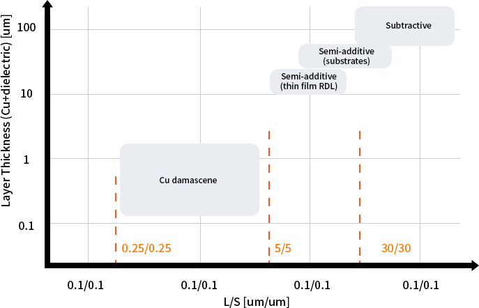 부품 밀집화로 인해 미세회로 요구 증가로 10um pitch 이하 기판 미세회로 공법 한계 극복 필요