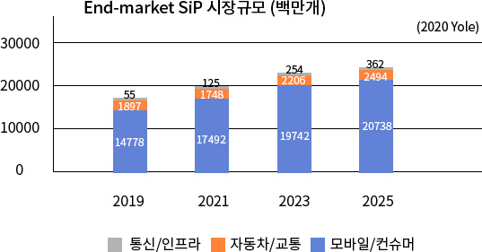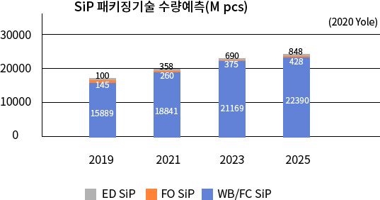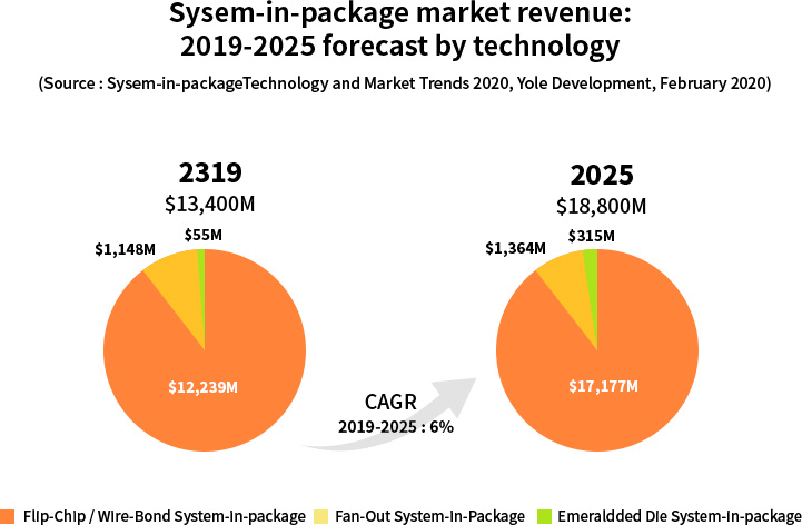 - - SiP 시장은 2019년에 134억달러의 패키지 수익을 기록했으며, CAGR 6%로 성장하여 2025년에 188억달러를 달성할 것으로 예상(Yole, 2020)