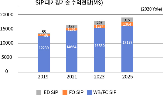 - - 현재 FC/WB SiP 시장은 12.2B$(SiP 패키징 매출의 90% 이상을 차지)로 평가되며, CAGR 2019-2025년 6% 성장하면서 2025년에는 17.1B에 이를 것으로 예측됨